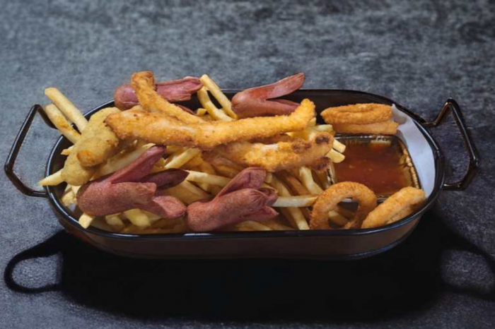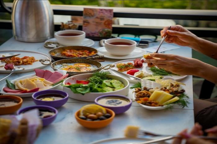 Zengin Kahvaltı Tabağı, beyaz peynir, kaşar, eritme ve tulum peyniri çeşitleri, siyah–yeşil zeytin, patates kızartması, sigara böreği, pişi, iki çeşit ekmek, pankek, reçel, acuka, sahanda yumurta, salam, jambon, sosis, taze domates, salatalık, yeşillikler, tereyağı, bal, çikolata, ceviz, incir ve sınırsız çay ile sunulan doyurucu bir seçenektir.